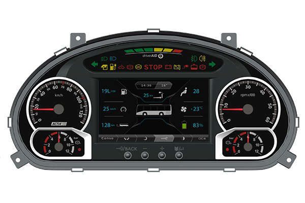 与传统客车仪表相比,MULTIC SV的优势显著,具备强大的CAN总线通讯能力。MULTIC SV最多可有5路CAN接口,可用J1939协议和底盘动力总成各ECU进行数据交换,特别有利于发挥欧五、欧六发动机的电控单元的强大功能。该款仪表带有一块7英寸800*480真彩色TFT显示屏,可以显示报警信息、油耗信息、仪表工作状态、时间信息,新能源系统信息等。此外,MULTIC SV仪表可向外提供车速信号、C3信号等常用信号。仪表的配置程序可以根据不同车辆的要求进行灵活的配置,输入信号类型可通过软件配置,对于一些常用参数的设置可以直接通过仪表的菜单完成,设置过程方便快捷,能够提供图形化界面操作,具有DriverAid功能,能够改善驾驶员开车习惯,减少燃油消耗,提升乘客舒适性。