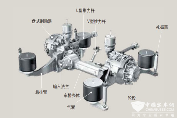 与AVE132低地板门式驱动后桥相配匹的RL85EC低地板独立悬挂前桥满足低地板或低入口公交客车的全面应用;高强度、易维护、可靠性高,轻量化设计可显著降低油耗及运营成本;独立悬架结构避免了左右车轮间运动的相互干扰,提高乘坐的舒适性;转弯半径比刚性车桥减少1米(同等轴距),提高车辆的机动性。