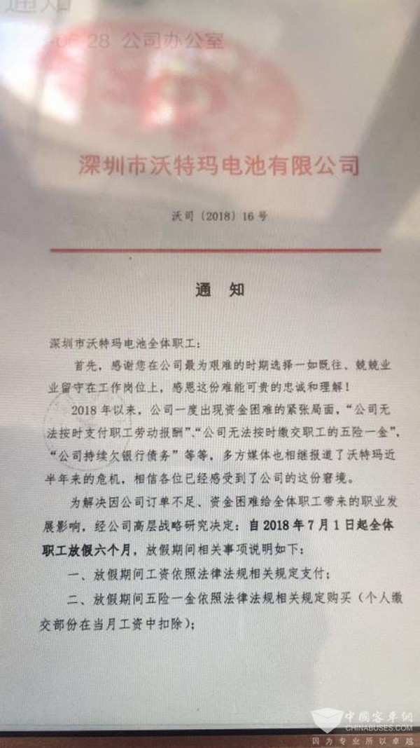 2018年6月28日,深圳市沃特玛电池有限公司向全体职工发出通知,称公司2018年以来一度出现资金困难的紧张局面,多方媒体也相继报道了近半年的危机,相信各位(员工)已经感受到了公司的这份窘境。