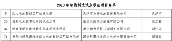 4家动力电池企业进入2018年智能制造试点示范项目名单