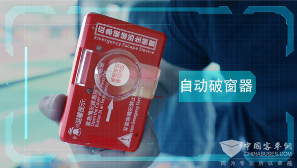 自动破窗装置是一种安装在客车侧窗角上的一种取代传统安全锤的工具。当车辆着火或紧急情况下,驾驶员只需按下装在其驾驶室旁的控制开关,或者乘客也可自行揭开防误触发盖,按下破玻按钮,一秒就可以启动破窗装置,击碎车窗钢化玻璃门,增加人员逃生窗口数量,从而让乘客更加迅速的逃离火灾现场,确保人员的安全性。