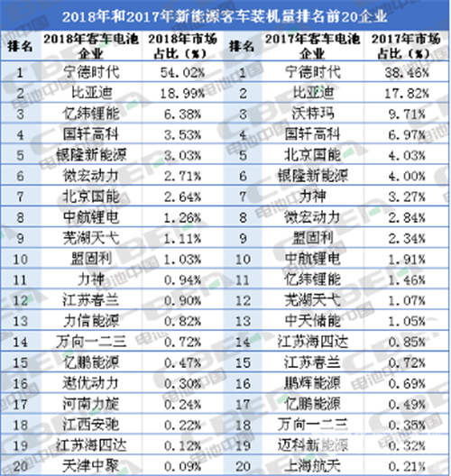 根据中国物理与化学电源行业协会动力电池应用分会数据,2018年新能源客车装机量达17.30GWh,同比增长21.60%。排名前10的电池企业装机量合计达16.38GWh,占2018年新能源客车总装机量的94.69%。