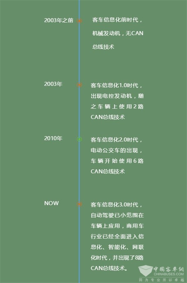2003年之前,客车行业处于机械发动机时代,信息化前时代客车并无CAN总线网络技术,车辆使用传统继电器/保险点对点控制设备,负载越多使用的线束便越粗。2003年,客车行业出现电控发动机,客车上传感器、执行器、ECU数量增多,随着客车功能的增多,客车信息化1.0时代车辆上开始使用2路CAN总线技术来满足需求。