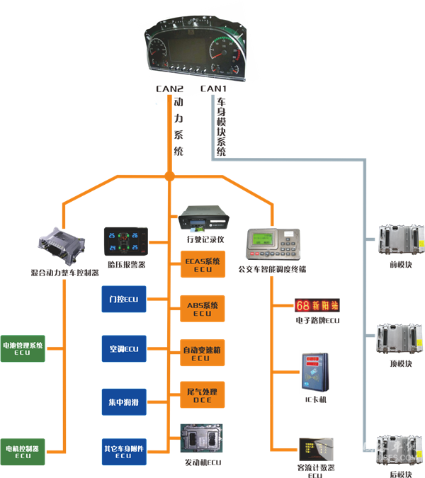 例如,CAN3是智能调度系统专用CAN,专门用于接入各种智能调度信息设备,可随意接入新增CAN设备,动力系统CAN和新能源系统CAN不随意接入其它任何CAN设备,从而保证了动力系统和新能源系统CAN通信的稳定可靠。