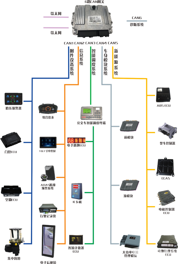 2010年,客车行业全面进入信息化2.0时代,电动客车的出现,原有的2路CAN已不能保证CAN网络负载率低于33%的要求,所以经常出现CAN信号通信不畅的问题,欧洲开始普遍使用6路CAN总线网络技术,从而根本上解决了CAN总线负载率过高导致的电气系统问题,尤其适用于信息化、智能化、网联化的新能源客车。