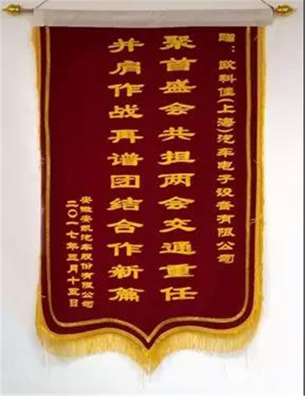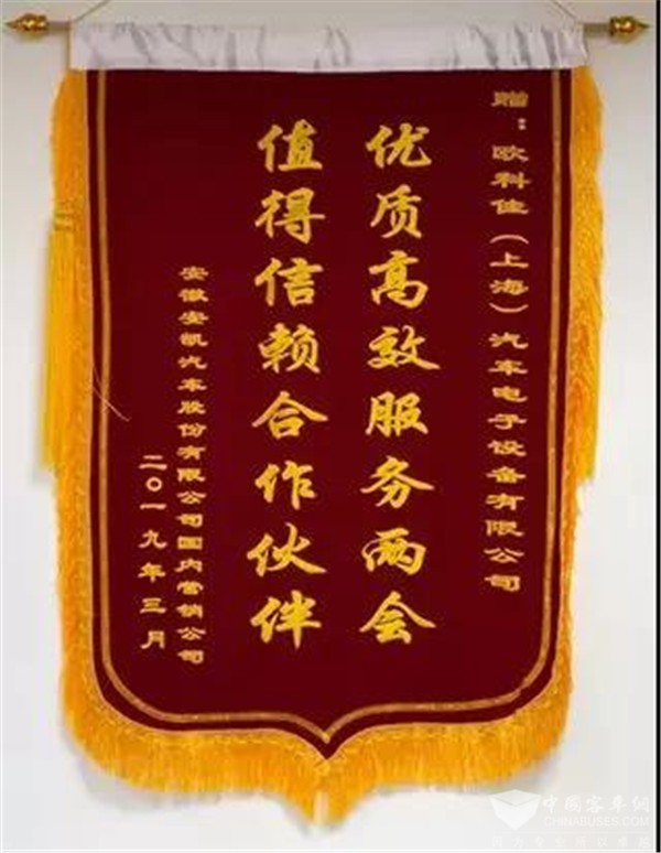 全国两会闭幕之后,2019年3月26日,欧科佳收获了来自安凯客车的一面锦旗,上面写着“优质高效服务两会,值得信赖合作伙伴”。这既肯定了欧科佳售后服务团队的专业能力和服务态度,也证明了欧科佳产品的可靠品质。