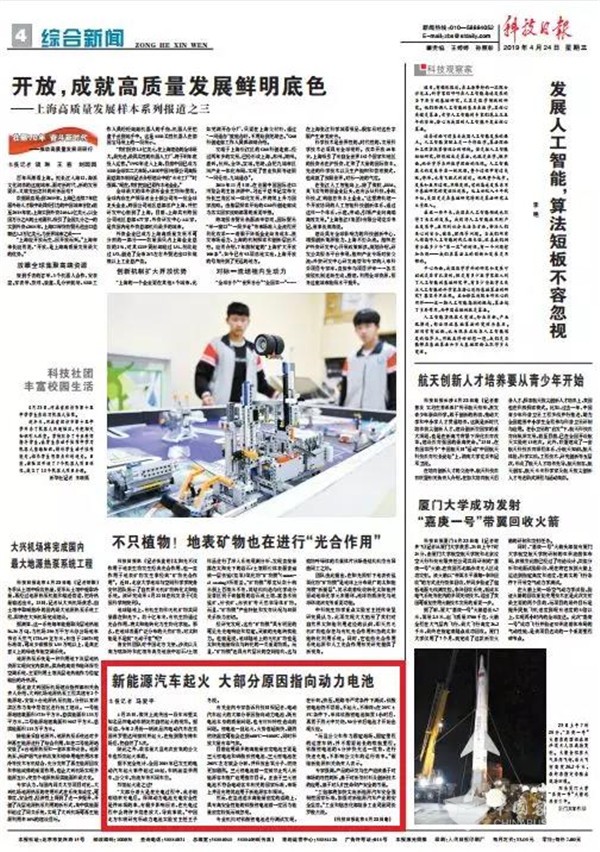 今日,科技日报发表《新能源汽车起火 大部分原因指向动力电池》中指出,产品的研发与生产应该基于对市场的理性判断、基于对新型材料及创新技术的应用、基于对人们生命财产安全的考量。