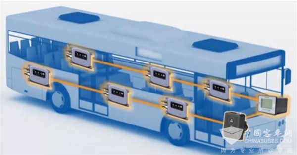 显示器显示车厢内各监测模块的安装位置与工作状态,并且可显示对应监测区域的报警级别,分LCD或OLED显示,具备CAN通讯和485通讯模块,可将报警信号上传至公交调度系统管理后台。