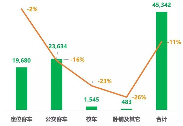 根据中国公路学会客车分会的统计,2019年1月-5月,7米以上中国客车销量为45,342辆,同比下降11%。其中座位客车销量19,680辆,同比下降2%;公交客车销量23,624辆,同比下降16%。