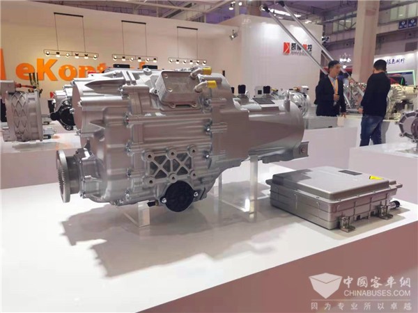 此次展会,凯博易控全新产品eDMT双电机变速驱动系统首度公开亮相。据介绍,该系统通过两个高转速、高效率电机并联搭载,配合模块化的变速器和高可靠性序列换挡机构,实现了无动力中断和功率的高效利用,大幅提高了驱动效率和产品的使用寿命。eDMT系统采用高速驱动电机,高效区范围更大、更宽,同时两个电机使控制更加灵活、负荷范围更合理,加上变速结构中高效率的圆柱斜齿传动的运用,形成了高精度、高平顺、低噪音的特点。此外,该系统还取消了湿式离合器、电子泵等持续性功率消耗元件,采用喷淋式主动润滑散热结构,在确保运动部件长期正常运转的同时,改善散热效果,有效降低了扰油损失,与传统的飞溅润滑相比更加节能。多种节能技术的综合应用,保证了凯博易控eDMT系统的高效率,其比功率、比扭矩较国内传统产品提升20%。