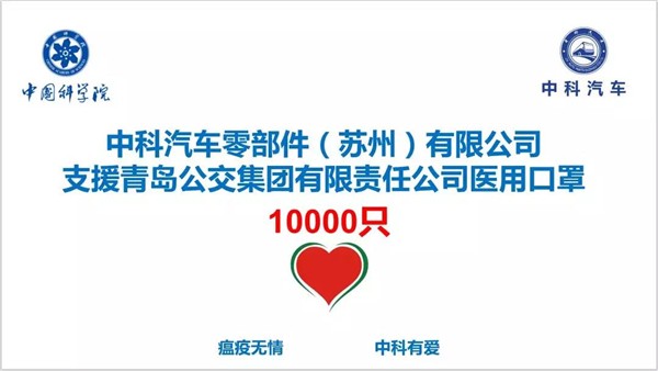 2020年2月19日,青岛公交集团有限责任公司收到中科汽车零部件(苏州)有限公司捐赠的医用口罩10000只。