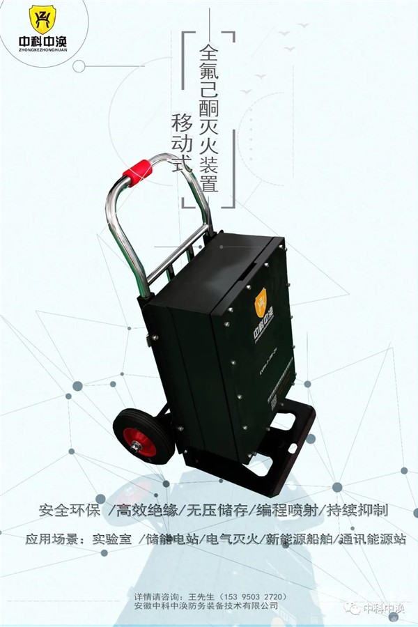 安徽中科中涣防务装备技术有限公司在现有的锂离子动力电池(箱)火灾抑制装置基础之上设计开发出“移动式全氟己酮灭火装置”,该装置具有安全环保、高效绝缘、无压储存、编程喷射、持续抑制等特点,且可广泛应用于实验室、储能电站、电气灭火、新能源船舶、通讯能源站等场所。