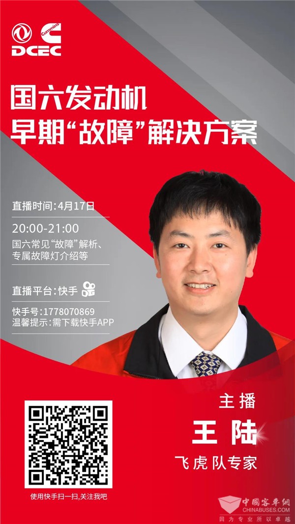 4月17日晚20:00-21:00,东风康明斯飞虎队专家王陆,在东风康明斯老友汇快手直播间现场直播,为您讲解,帮您了解国六早期“故障”。