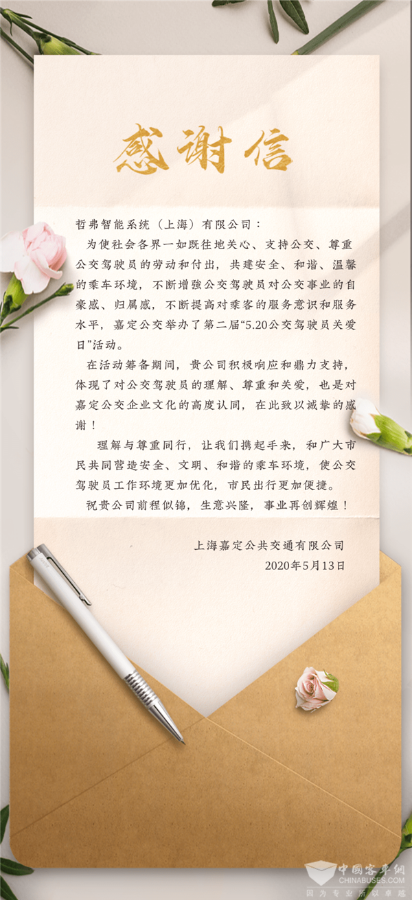 2020年5月14日,哲弗收到了这样一封感谢信......这封信来自哲弗的好朋友:上海嘉定公共交通有限公司。