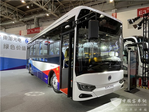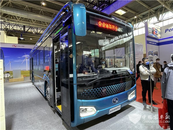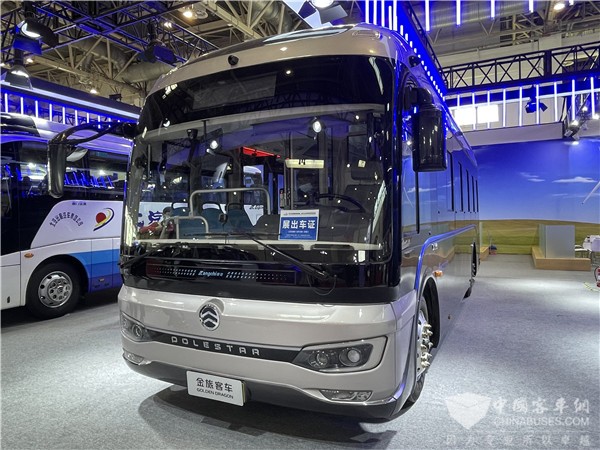 车展现场展示的金龙地铁巴士具有超大面积前挡玻璃,视野开阔,同时设计凸显实用美学新造诣;窄边框造型搭配浮雕式轮眉,整体外观立体大方。