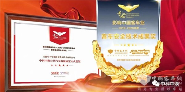 2020年3月18日,在第14届影响中国客车业系列活动线上发布会中,中科中涣潜心研发的公共汽车客舱固定灭火装置荣获客车安全技术成果奖。