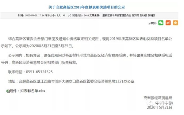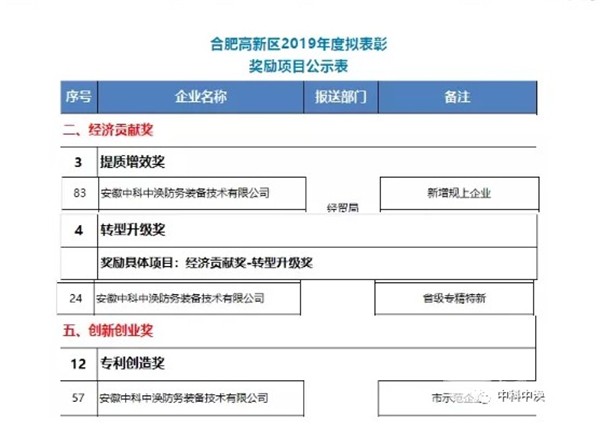 合肥市高新区经济贸易局对2019年度高新区拟表彰奖励项目名单予以公示,其中中科中涣凭借转型升级、提质增效以及突出的科技创新能力,在此次表彰中荣获两项“经济贡献奖”、一项“创新创业奖”。