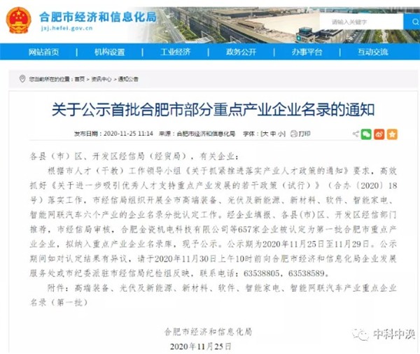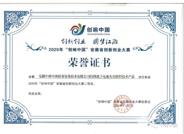安徽省经济和信息化厅官网发布了“2020安徽省拟评定首台套重大技术装备名单”,安徽中科中涣防务装备技术有限公司的“电动客车锂离子动力电池(箱)火灾防控产品”荣列其中。