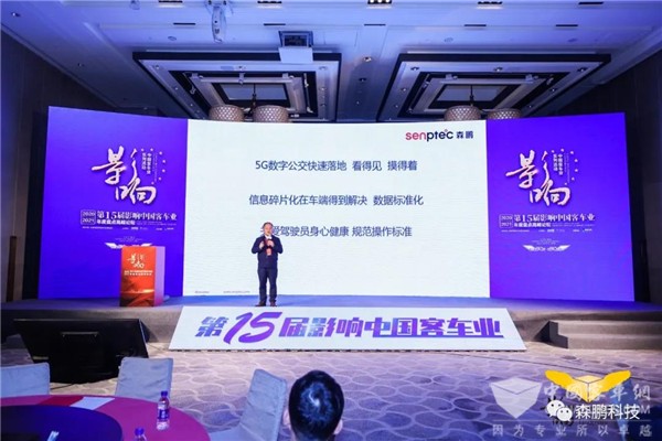 森鹏受邀参加此次活动,并于盘点颁奖典礼环节摘得“客车智能化技术成果”和“客车技术创新应用成果”两项殊荣。森鹏科技客车事业部总经理袁丁应邀发表主旨演讲:公交客车5G数字驾驶舱是实现信息一体化的基础。