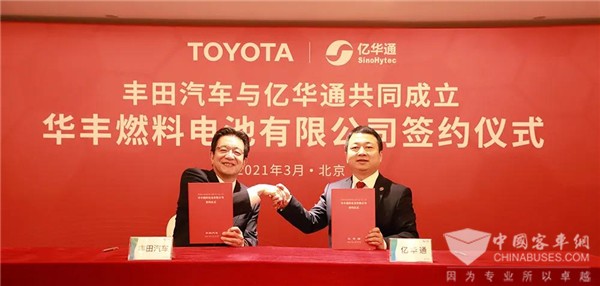 2021年3月29日,北京亿华通科技股份有限公司(以下简称 亿华通)和丰田汽车公司(以下简称丰田),就在中国成立推进商用车燃料电池系统事业的合资公司,即“华丰燃料电池有限公司”(以下简称 FCTS)签订合约。