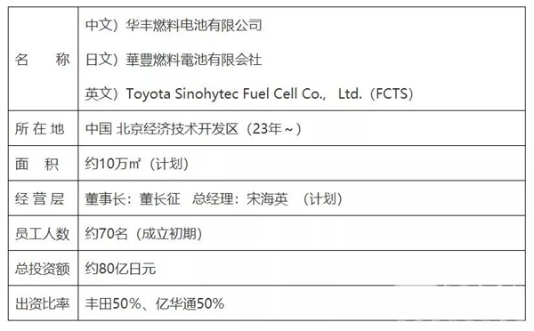 2020年8月,亿华通、丰田及其他4家汽车厂商共同成立了“联合燃料电池系统研发(北京)有限公司”(以下简称FCRD),此次新公司FCTS将生产及销售FCRD开发的燃料电池系统,并于2021年成立,总投资额约为80亿日元,亿华通和丰田各出资50%。