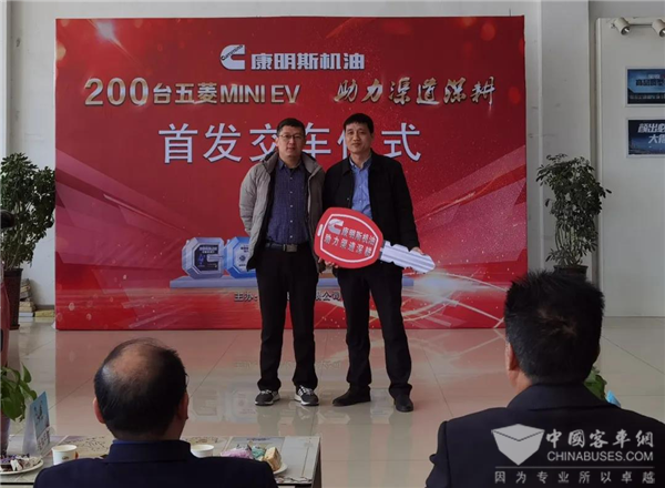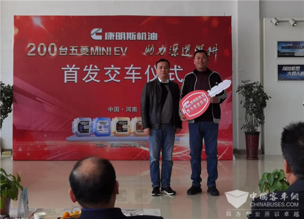 2021年3月22日,在南阳地区举行了盛大的首发交车仪式,现场交付车辆10台,其中6台五菱MINI,4台五菱宏光。东风康明斯服务总监、备件事业部经理、区域营销经理、东康化工总经理、以及来自河南地区的客户代表、经销商代表等人,共同见证了康明斯机油首批一季度向客户交车的热烈场景。