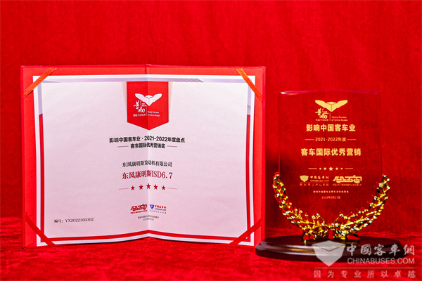 2022年2月23日,在第16届影响中国客车业年度盘点活动中,东风康明斯ISD6.7系列发动机凭借出色的海外产品力、品牌力及用户口碑荣获2021-2022年度“客车国际优秀营销奖”。这是继第15届影响中国客车业年度盘点活动中,东风康明斯ISL8.9客车用发动机夺得2020-2021年度“国际营销协作奖”后,东风康明斯成功蝉联国际营销大奖。