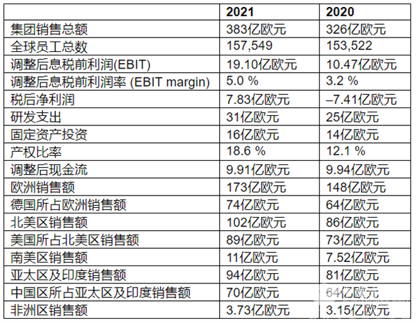 2021年,采埃孚集团实现销售额383亿欧元(2020年为326亿欧元),同比增长17.5%。调整后息税前利润(EBIT)达到19.1亿欧元(2020年为10.47亿欧元),调整后息税前利润率(EBIT margin)提升至5.0%(2020年为3.2%)。并购后经调整的自由现金流为9.91亿欧元(2020年为9.94亿欧元)。采埃孚首席财务官康斯坦丁·绍尔(Konstantin Sauer)博士说:“市场动荡与盈利预警及预测调整相生相伴,我们成功地在预测范围内达成了目标,这说明我们不仅有能力加大投资,也有能力减少负债、加强产权比率。”2021年,采埃孚的总负债下降了7.52亿欧元,缩减至125亿欧元,产权比率增加至约19%(2020年为12.1%)。