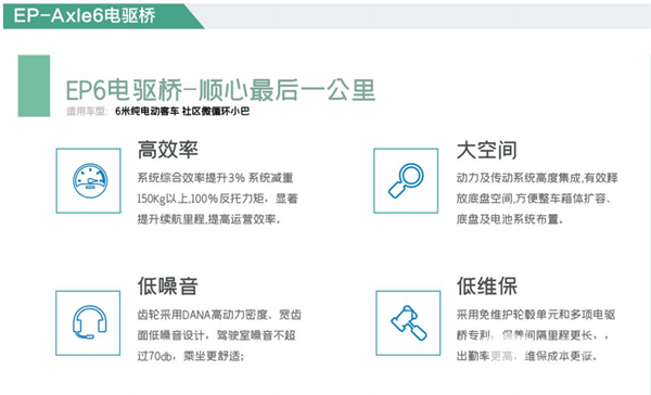 众所周知,车桥对客车的动力性、稳定性、承载能力等方面有着重要的影响。东风德纳EP-Axle6电驱桥集“电机、传动轴、驱动桥”为一体,系统高度集成,电机转速高,外形尺寸小,功率密度大,成为社区出行、地铁接驳、景区交通等微循环巴士的“最佳拍档”。