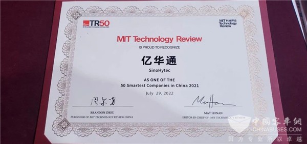 2022年7月29日, EmTech China 全球新兴科技峰会暨50家聪明公司发布仪式在无锡举办,全球知名杂志《麻省理工科技评论》在峰会上发布了2021年度中国“50家聪明公司”(TR50)名单。亿华通凭借卓越的技术创新能力及广泛的市场影响力荣登TR50榜,是国内氢能及燃料电池领域唯一入选企业。