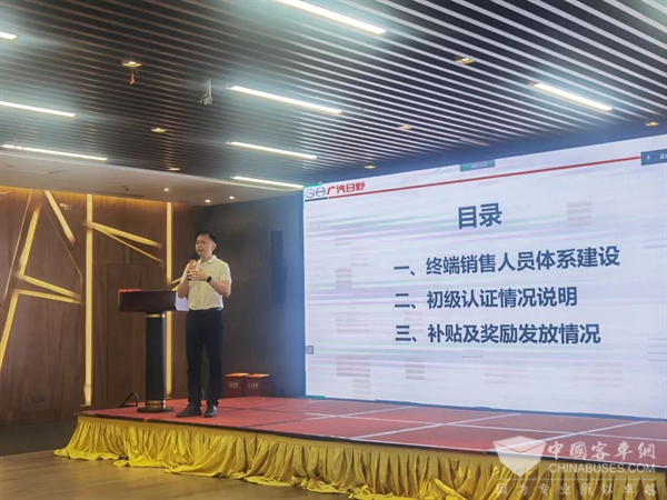本次活动现场,广汽日野发布了《终端销售人员体系建设》,对特约店销售人员培训认证工作进行总结,现场颁发销售人员证书,并进行表彰奖励。