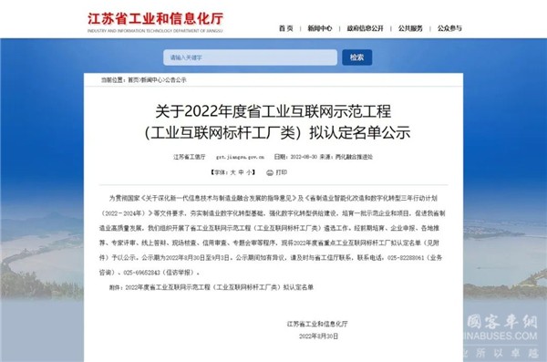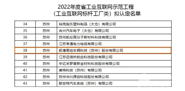 近日,江苏省工业和信息化厅正式公布“2022年度省工业互联网示范工程项目(工业互联网标杆工厂类)”名单,经企业申报、各地推荐、专家评审、现场考核、网上公示等环节,凯博易控车辆科技(苏州)股份有限公司榜上有名!
