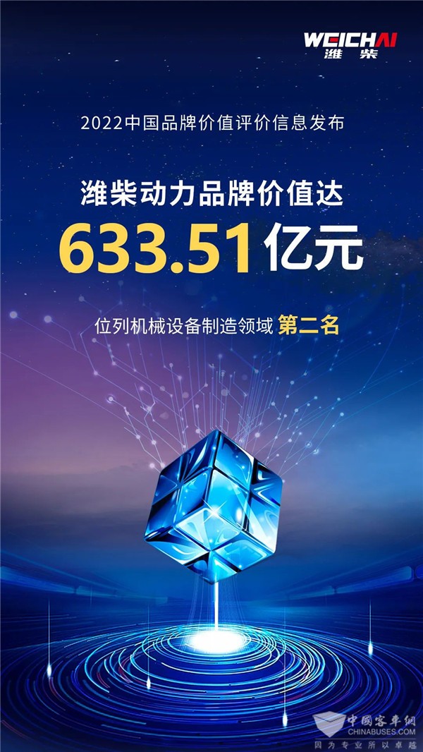 近日,2022中国品牌价值评价信息发布会线上召开,潍柴动力品牌价值达633.51亿元,位列机械设备制造领域第二名,较去年同比增长4.15%。