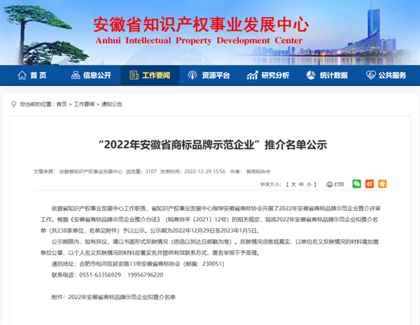依据省知识产权事业发展中心工作职责,省知识产权事业发展中心指导安徽省商标协会开展了2022年安徽省商标品牌示范企业推介评审工作,并将推介名单予以公示。安徽中科中涣成功通过专家评审,获评“安徽省商标示范企业”。