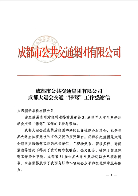 感谢信称,由衷感谢东风德纳车桥对成都公交承接的成都第31届世界大学生夏季运动会交通“保驾”工作的支持和帮助,在现场复杂、需求多样、时间紧迫等情况下积极响应、全力配合,确保了交通保驾工作安全平稳,向全体保驾人员冒酷暑、战高温的日夜坚守表示感谢。