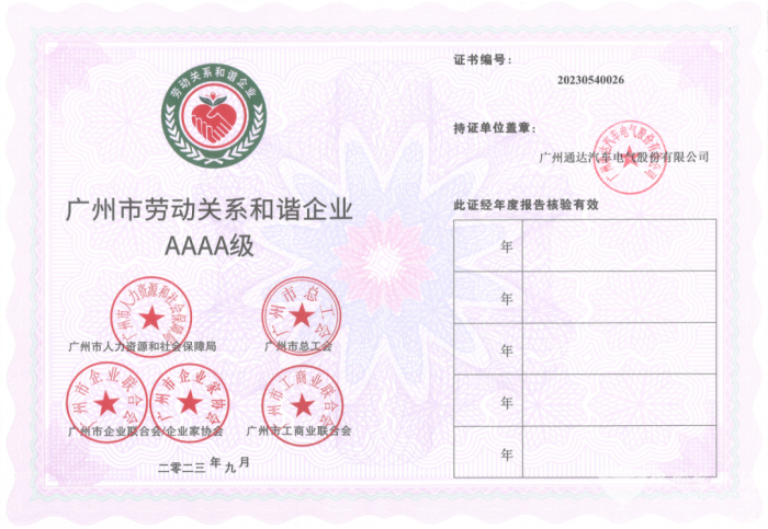 完美作业网有免费视频2023年12月8日获悉,广州市人力资源和社会保障局、广州市总工会、广州市企业联合会、广州市企业家协会、广州市工商业联合会公布了2022年度广州市劳动关系和谐单位名单,经区劳动关系三方协商会议初审、市劳动关系三方协商会议复审,通达电气成功获评“广州市劳动关系和谐企业AAAA级”。彰显了公司在维护劳动者权益、推动企业治理体系和文化建设方面的卓越成果。