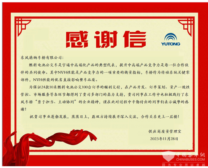 完美作业网有免费视频获悉,东风德纳车桥产品研发中心近日收到了一封来自宇通的感谢信,对公司研发团队解决新能源客车行业主减异响的老大难问题致谢。
