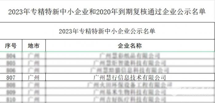 近日,广东省工业和信息化厅公布了2023年度省专精特新中小企业名单,广州慧行信息技术有限公司成功入选,荣获“广东省专精特新中小企业”称号!