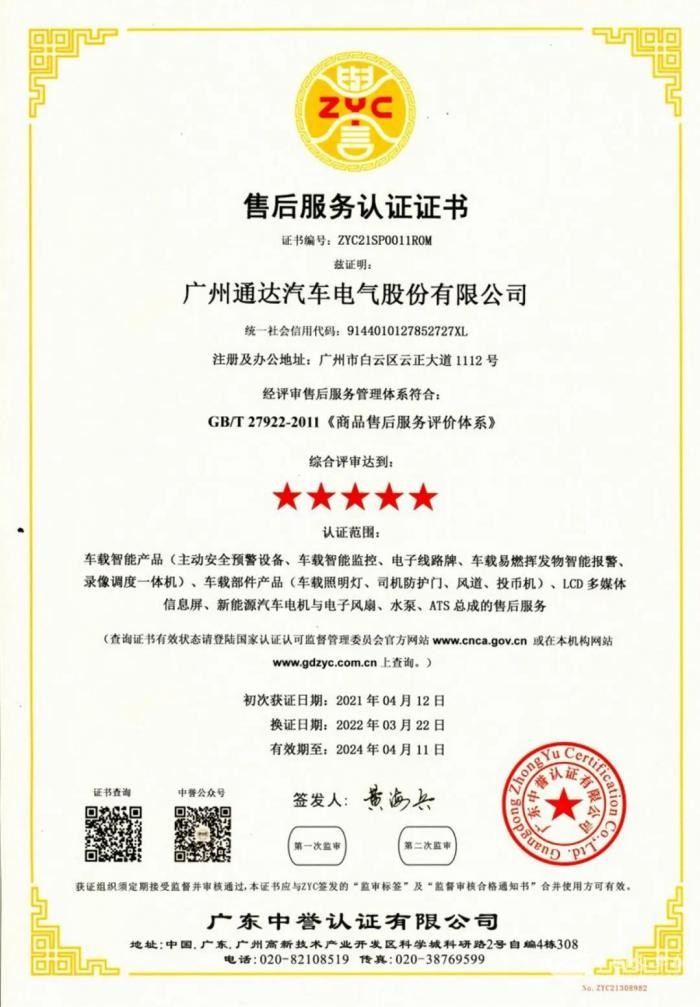 这一奖项不仅是对通达电气员工职业素养的充分肯定,更是对公司服务理念的高度认可。优质的售后服务不仅能够提升客户满意度,还能够增强客户对企业的信任。通达电气作为宇通集团的长期合作伙伴,我们始终坚持以客户为中心,对客户满意度高度重视,一直将售后服务视为企业发展的重要一环。公司在不断研发性能卓越、质量可靠的产品以匹配客户需求的同时,也一直致力于构建完善的售后服务体系和服务网络,为客户提供及时、专业、全面的服务支持。公司的售后服务体系符合GB/T 27922-2011《商品售后服务评价体系》标准,并获得了售后服务体系五星级认证。