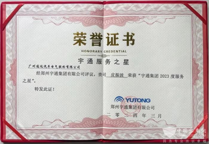 服务理念受认可 通达电气皮振波荣获宇通集团这一奖项