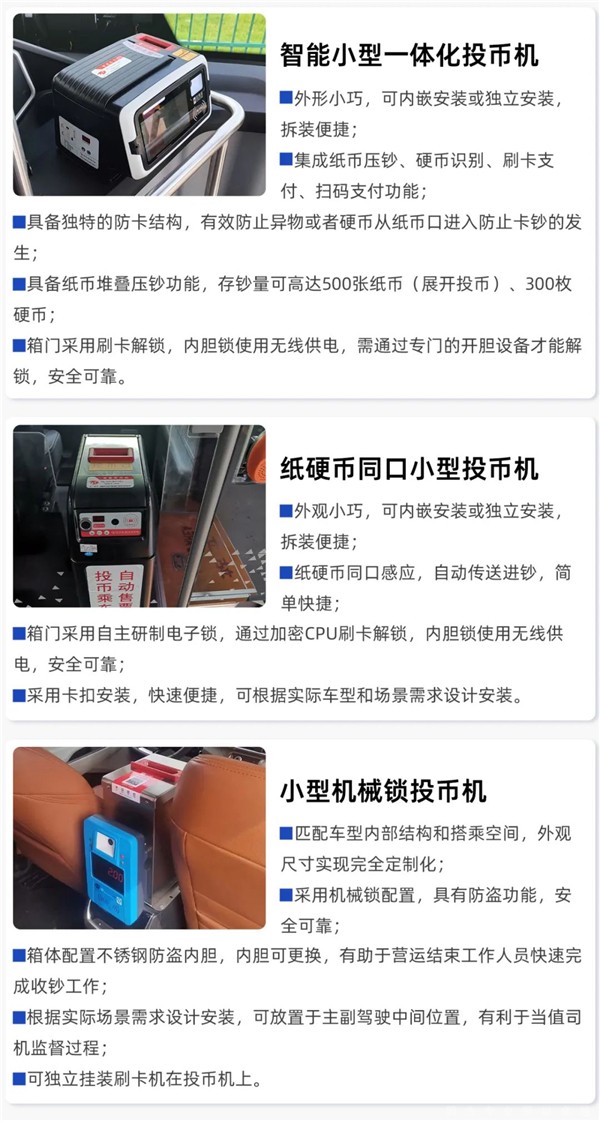 通达电气研发团队根据小微公交应用场景需求、个性化功能需求,自主研发智能小型一体化投币机、纸硬币同口小型投币机、小型机械锁投币机等三款小型化投币机,并可根据客户的实际应用需求,进行定制化安装设计,高度匹配不同车型和场景需求。