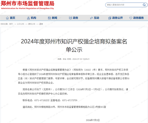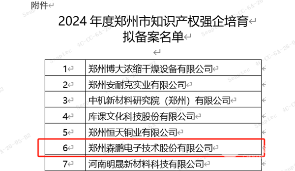 据了解,近日,郑州市市场监督管理局公示了《2024年度郑州市知识产权强企培育拟备案名单》,郑州森鹏电子技术股份有限公司凭借其卓越的技术研发能力、强大的创新能力以及完善的知识产权管理体系,成功入选为郑州市知识产权优势企业。