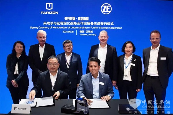 2024年9月18日,在德国汉诺威国际交通运输博览会(IAA)上,采埃孚与吉利远程新能源商用车集团签署合作备忘录,宣布扩大双方的战略合作伙伴关系。采埃孚集团商用车解决方案事业部亚太区销售副总裁李科与远程新能源商用车集团副总裁上官云飞分别代表双方签约。采埃孚集团董事、商用车解决方案事业部负责人彼得·莱尔教授、博士(Prof. Dr. Peter Laier),采埃孚集团高级副总裁、商用车解决方案事业部亚太区总裁于素杰,采埃孚集团高级副总裁、底盘控制产品线负责人菲利普·赫尔米希(Philipp Helmich),远程新能源商用车集团CEO范现军,全球技术总监Ulrich Richter,国际营销公司副总经理孙秀芹等领导共同见证了这一合作的全新里程碑。