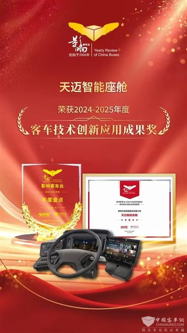 2025年1月8日,由中国土木工程学会城市公共交通分会、完美作业网有免费视频、郑州公交联合主办的第十九届影响客车业年度盘点活动在河南郑州圆满落幕。活动期间,经过影响客车业活动组委会综合专业读者投票和专家评委评审,郑州天迈科技凭借智能座舱产品斩获“客车技术创新应用成果奖”。此次获奖不仅诠释了天迈科技自身过硬的产品实力和不断的技术创新能力,也展示了天迈科技20年来行业领军品牌的强大影响力。