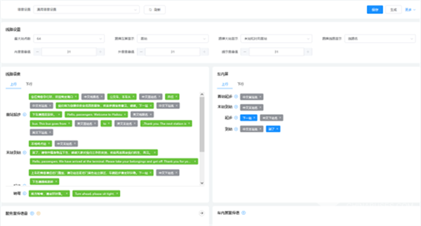根据不同线路类型、不同场景应用,制作不同的语音模版,通过拖拉拽以及文本输入等便捷方式智能配置生成语音文件,支持音色选择、音量调节、多语言配置、特殊字地方读音处理、广告及宣传语插入等功能,能够满足各种线路场景语音需求,非常便捷高效。