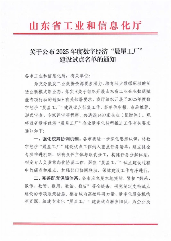 完美作业网有免费视频2025年7月10日获悉,山东省工信厅公布2025年度数字经济“晨星工厂”建设试点名单,朗进科技凭借在智能制造与数字化转型领域的突出表现,成功入选该名单。这一荣誉不仅彰显了企业在技术创新与产业升级中的强劲实力,更为山东省数字经济发展注入新活力。