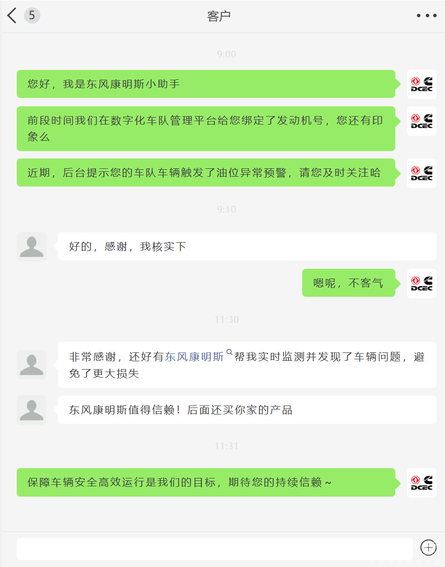 近期,东康一客户在深度了解数字化车队管理平台后,成功绑定了车队信息,后续运营过程中,某车辆触发了「油位异常」预警,发现问题后,东风康明斯第一时间同步客户,并详细叙述了情况。