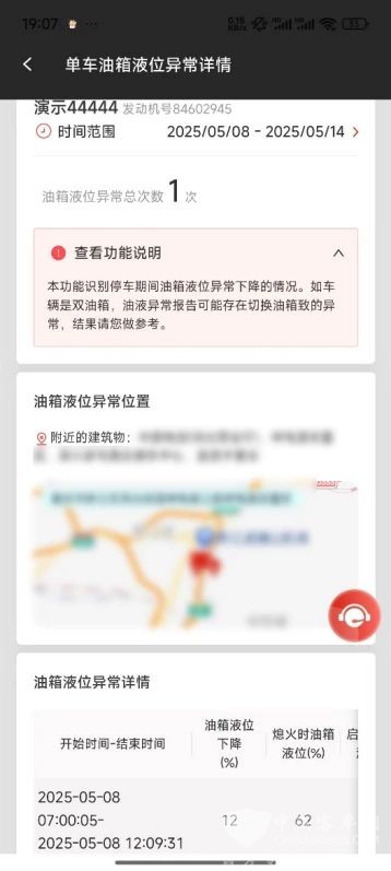 一旦系统判定液位下降超出合理阈值或呈现异常模式,便会立即触发警报。对于车队管理者,这项功能的价值在于快速发现油箱液位异常情况,使其能够迅速定位问题车辆,查看异常发生的具体时间和地点信息,从源头上遏制燃油的额外消耗。