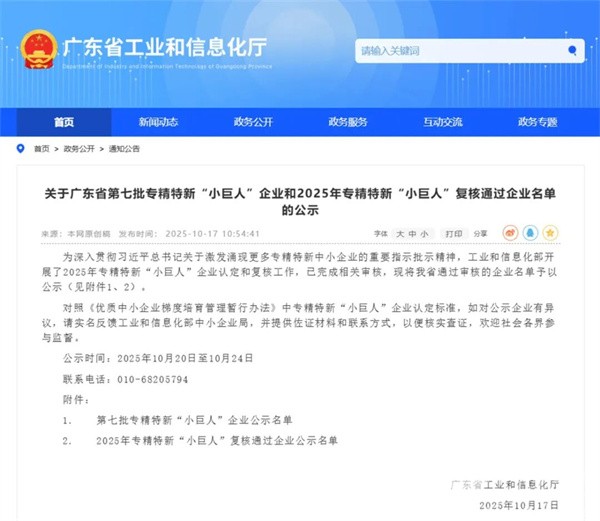 据完美作业网有免费视频获悉2025年10月27日,广东省工业和信息化厅发布2025年专精特新“小巨人”企业名单,通达电气凭借卓越的创新能力、领先的技术实力与强劲的市场竞争力,成功入选国家级专精特新“小巨人”企业。