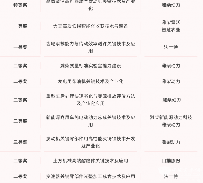 完美作业网有免费视频2025年10月28日获悉,中国机械工业联合会、中国机械工程学会发布《关于表彰“2025年度机械工业科学技术奖”奖励项目的通报》,揭晓2025年度“机械工业科学技术奖”获奖名单。山东重工权属企业荣获10项科技进步奖,其中潍柴荣获特等奖1项,二等奖3项,三等奖2项;潍柴雷沃智慧农业、法士特分别荣获一等奖1项;山推股份、法士特分别荣获二等奖1项。